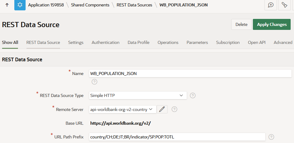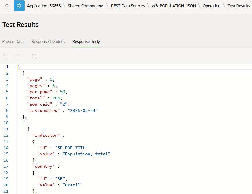 Configured to consume the World Bank API through a native REST Data Source in Oracle APEX.