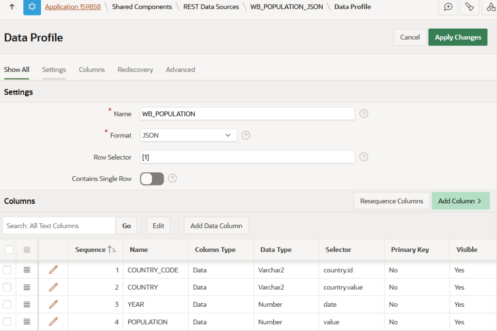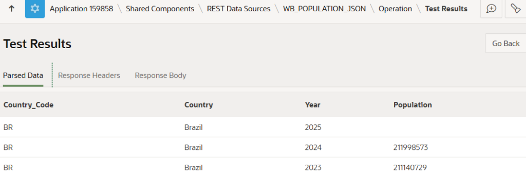 This mapping exposes the JSON structure as a relational dataset, enabling native APEX components to consume external data without transformation layers, custom parsing, or local persistence.